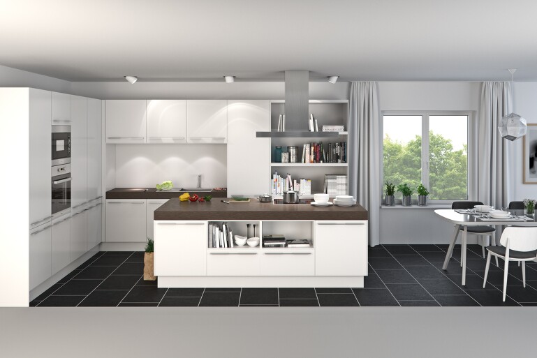 Zur kreativen Küchenplanung gehören aber auch die berühmten kleinen Details. Denn oft sind es die vermeintlich unwichtigen Kleinigkeiten, die in den individuellen Lebensumständen am Ende doch sehr wichtig sind. Das reicht vom einzuplanenden Hunde-Fressplatz über ergonomische Faktoren bei unterschiedlich großen Familienmitgliedern bis hin zur gewünschten Blickrichtung aus dem Fenster beim Kochen. Diese Liebe zum Detail zeigt sich bei kreativen Küchenplanern auch im Einbezug des Küchenumfeldes. Und hier sind die Möglichkeiten nahezu unerschöpflich – denn von der indirekt beleuchteten Sockelleiste über den raffiniert integrierten Klapptisch bis zum Bogenelement in Trockenbauweise ist alles möglich.